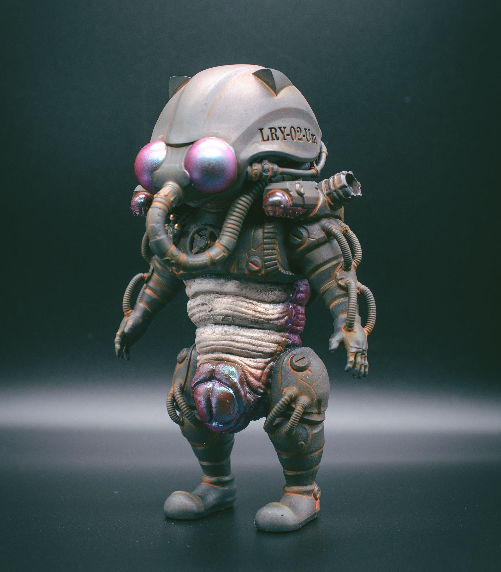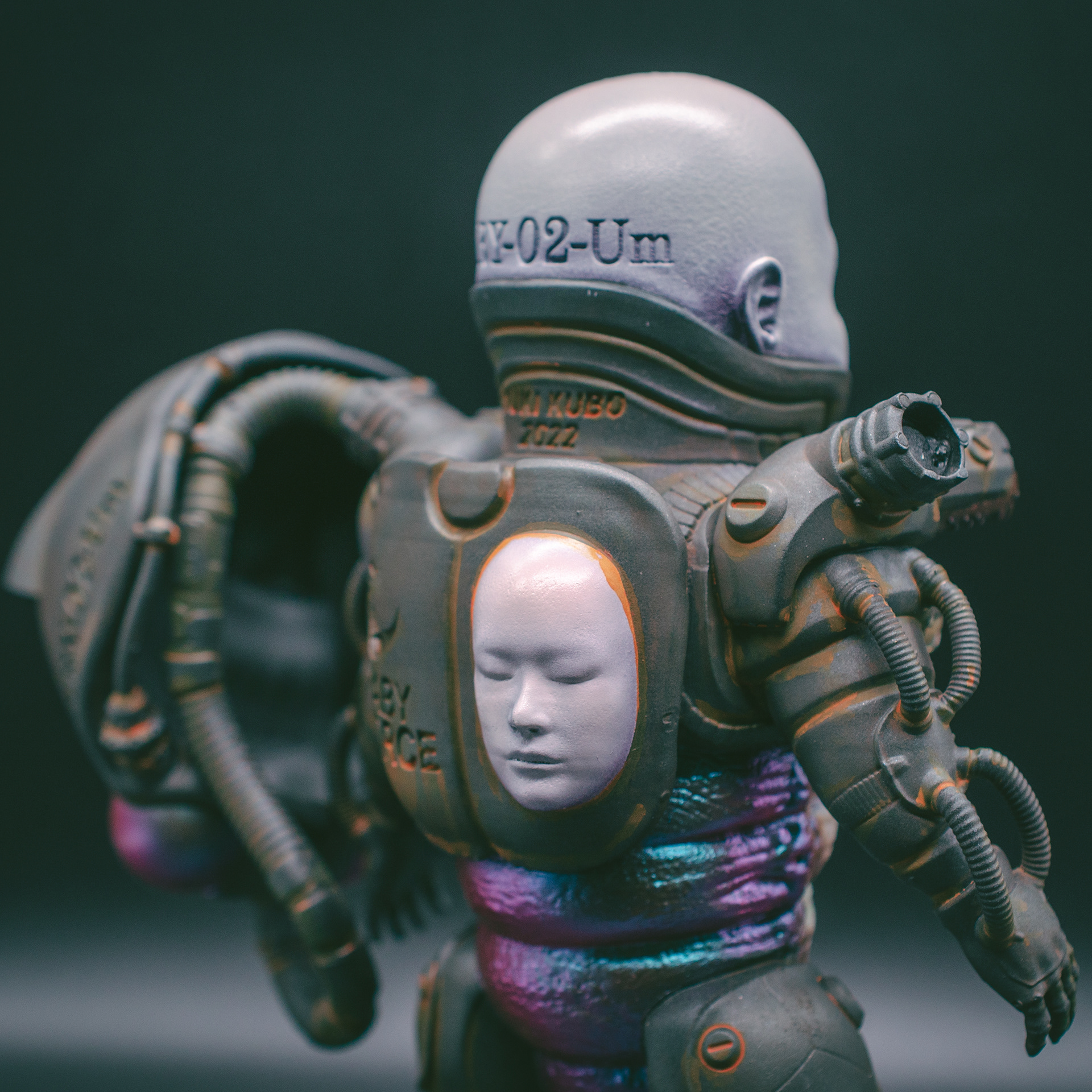 He is equipped with cannons on his shoulders.